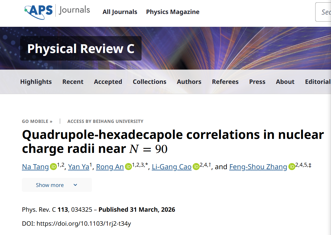 2026年3月31日,物理学院理论物理组青年教师唐娜博士和安荣博士与北京师范大学曹李刚教授和张丰收教授,在美国物理学会权威期刊《Physical Review C》上发表题为《Quadrupole-hexadecapole correlations in nuclear charge radii near N = 90》的原创性论文。文章通过同时约束四极形变和十六极形变的方法,系统描述了中子数N=90附近原子核电荷半径的演化趋势。文中指出,在N=90处原子核电荷半径会发生形状相变,同时四极矩和十六极矩之间的强耦合行为也会影响电荷半径的数值大小。唐娜博士是该论文的第一作者,2024级硕士研究生雅燕(学号:12024130700)为该论文的第二作者,安荣博士是该论文的第一通讯作者,宁夏大学物理学院为该论文的第一完成单位。沿着同位素链,电荷半径的系统演化行为可以很好地反映原子核的结构信息。在核素图中的一些特殊区域,例如中子数N=60和N=90附近,电荷半径会发生明显的增大趋势,通常认为电荷半径在这些区域的突然增大是由形状相变引起的。该论文中,为了精确描述电荷半径的演化趋势,在均方根电荷半径公式中引入了费米面附近中子与质子之间的关联性修正。同时考虑了原子核四极矩和十六极矩之间的关联性对电荷半径演化趋势的影响,研究表明,高阶形变在精确描述原子核电荷半径中起到了很重要的作用;进一步讨论了对关联对N=90区域原子核电荷半径的影响,结果表明,对相互作用形式可以定量地影响电荷半径的数值结果。该论文是我校“双一流”建设的一项重...